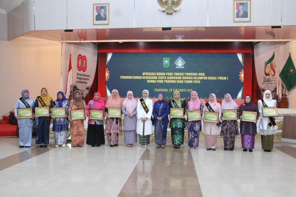 Pekanbaru – Bunda PAUD Kabupaten Indragiri Hilir (Inhil), Hj. Katerina Susanti, SKM, M.Kes menghadiri acara Apresiasi Bunda PAUD Tingkat Provinsi Riau tahun 2025 yang dirangkai dengan penandatanganan kerjasama serta launching inovasi Kelompok Kerja (Pokja) PAUD Provinsi Riau. Kegiatan berlangsung di Gedung Balai Serindit, kediaman Gubernur Riau, Jumat (26/9/2025).