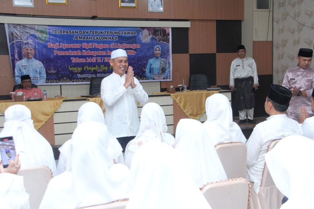 Tembilahan – Bupati Indragiri Hilir, H. Herman, SE, MT menghadiri acara pelepasan dan tepuk tepung tawar jemaah calon haji dari kalangan Aparatur Sipil Negara (ASN) di lingkungan Pemerintah Kabupaten Indragiri Hilir Tahun 1447 H/2026 M. Kegiatan tersebut digelar di Aula Bappeda Kabupaten Indragiri Hilir, Jumat (24/4/2026).