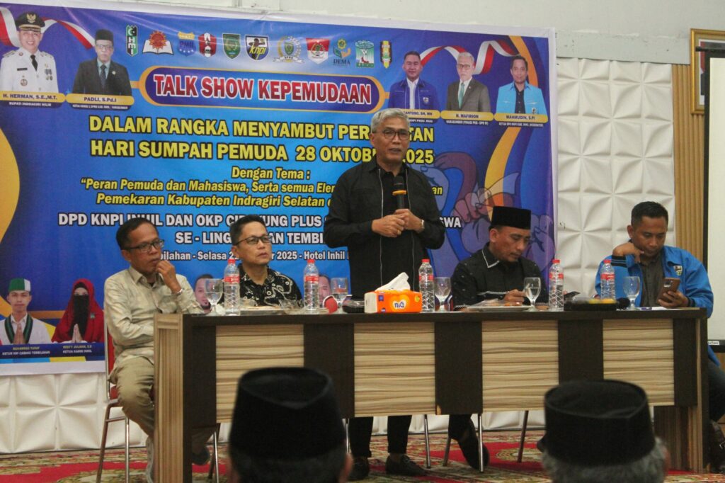 Bupati Kabupaten Indragiri Hilir (Inhil) yang diwakili oleh Asisten I Sekretariat Daerah Inhil, H. Fajar Husin menghadiri Talk Show Kepemudaan, yang digelar di salah satu Hotel di Kota Tembilahan, selasa (21/10/2025) malam.
