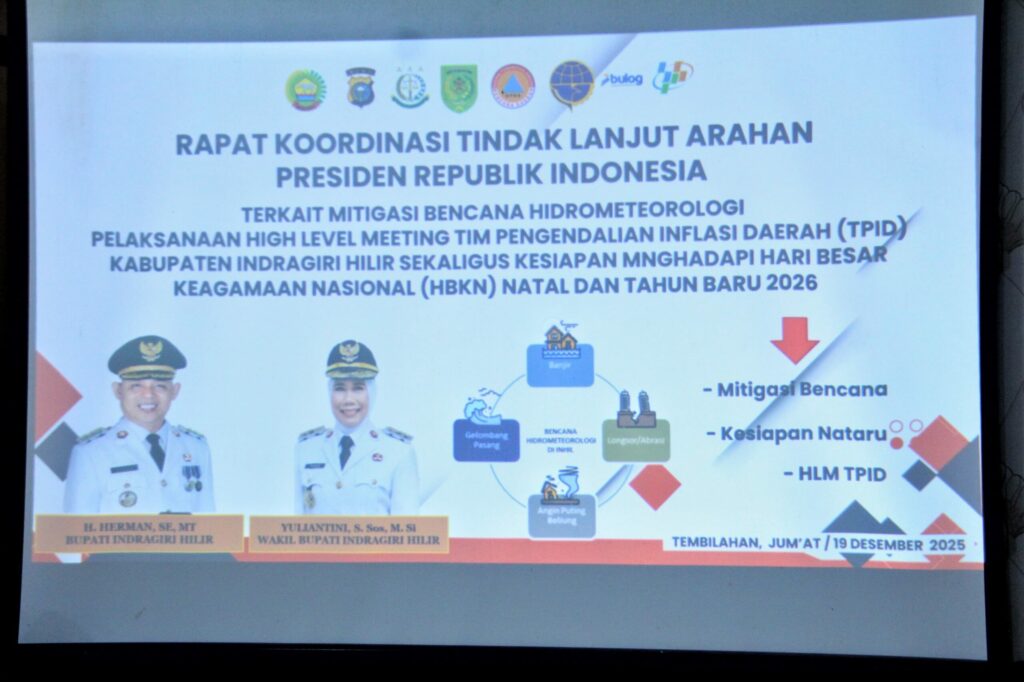 Tembilahan – Bupati Indragiri Hilir (Inhil) H. Herman, SE, MT memimpin Rapat Koordinasi Tindak Lanjut Arahan Presiden RI terkait mitigasi bencana hidrometeorologi, pelaksanaan High Level Meeting Tim Pengendalian Inflasi Daerah (TPID), serta kesiapan menghadapi Hari Besar Keagamaan Nasional (HBKN) Natal dan Tahun Baru 2026. Rapat berlangsung pada Jumat, 19 Desember 2025, di Aula Bappeda Kabupaten Indragiri Hilir.