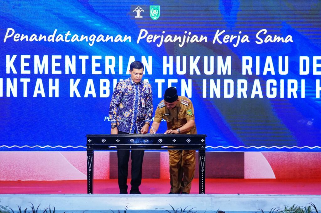 Pekanbaru – Bupati Indragiri Hilir (Inhil) H. Herman, SE., MT menandatangani perjanjian kerjasama antara Pemerintah Daerah Kabupaten Indragiri Hilir dengan Kantor Wilayah Kementerian Hukum dan HAM Provinsi Riau yang dipimpin oleh Kakanwil Rudy Hendra Pakpahan, bertempat di Balai Serindit, Gubernuran Riau, Selasa (20/10/2025).