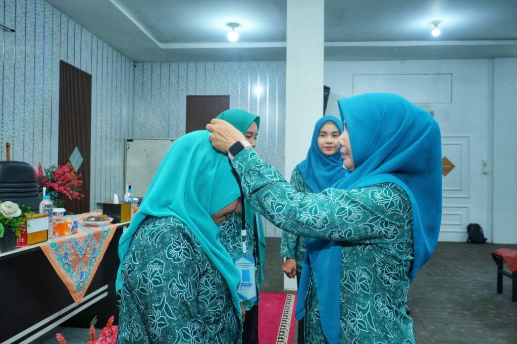 Pembukaan pelatihan yang ditandai dengan pemasangan tanda peserta oleh Ketua TP PKK Ibu Katerina Susanti, SKM, M.Kes kepada 2 orang perwakilan.