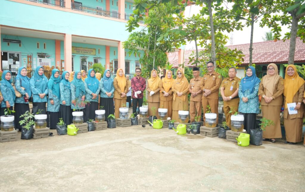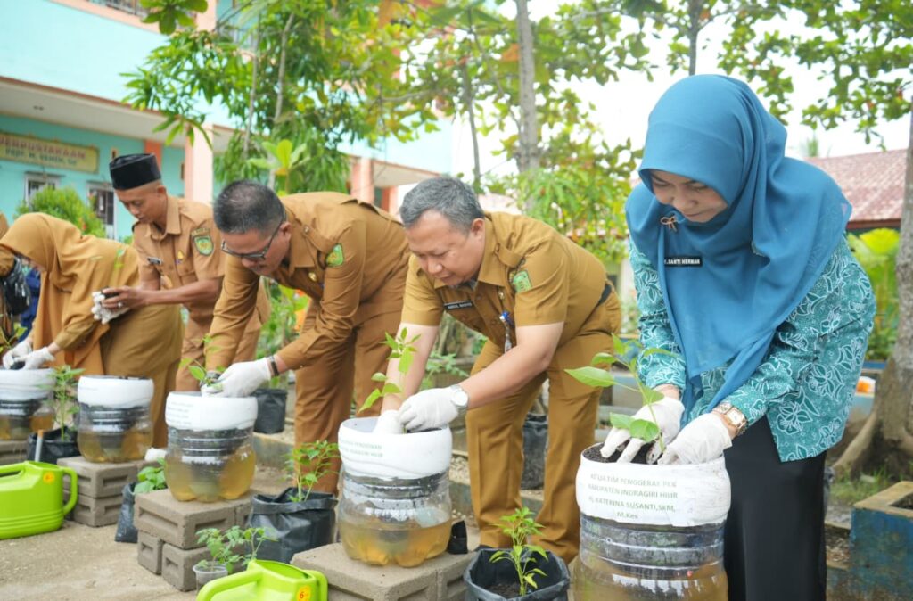 Pada kesempatan tersebut, Ketua TP PKK Inhil bersama para undangan juga melakukan penanaman bibit cabai di halaman SMP Negeri 1 Tembilahan sebagai bentuk edukasi pemanfaatan lahan sekolah.