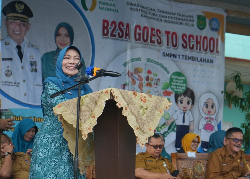Tembilahan – Ketua Tim Penggerak PKK Kabupaten Indragiri Hilir, Hj. Katerina Susanti, SKM., M.Kes, melanjutkan kegiatan Kampanye B2SA (Beragam, Bergizi, Seimbang, dan Aman) Go To School sekaligus Gerakan Masyarakat Hidup Sehat (GERMAS) di SMP Negeri 1 Tembilahan, Senin (15/12/2025).