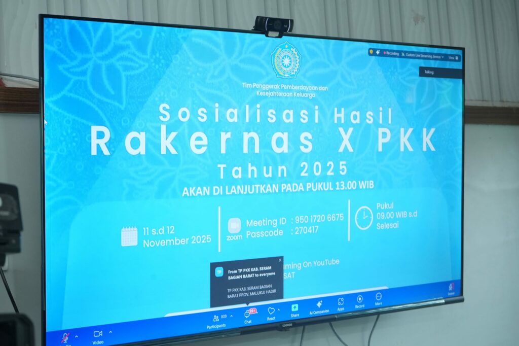 Tembilahan- Bertempat di ruang rapat Diskominfopers, Ketua Tim Penggerak PKK Kabupaten Indragiri Hilir Hj. Katerina Susanti Herman bersama seluruh Pengurus PKK Kabupaten Inhil mengikuti Sosialisasi Hasil Rakernas Ke X Tahun 2025 yang dilaksanakan pada tanggal 11-12 November secara virtual melalui zoom meeting, Selasa (11/11/2025).